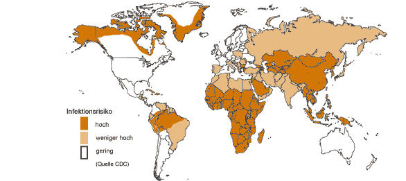 Malaria ist eine der weit verbreitesten Infektionskrankheiten des Menschen. Jährlich treten weltweit schätzungsweise 200 Millionen Neuinfektionen auf. In vielen Ländern Südostasiens, Mittel- und Südamerikas ist Malaria weitgehend auf ländliche Gebiete beschränkt. In Afrika oder Indien macht Malaria aber auch vor Großstädten nicht Halt. In Höhen über 1.500 Meter ist das Malaria-Risiko gering, in heißen Klimazonen kann Malaria jedoch bis in Höhen von 3.000 Meter auftreten.