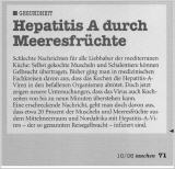 Die Hepatitis A ist eine weltweit vorkommende Virusinfektion, die vornehmlich durch virus-kontaminierte Speisen, z.B. Muscheln, Eis oder Salat übertragen wird. Ein erhöhtes Infektionsrisiko besteht vor allem für nicht-immune Personen bei Reisen in Länder mit hohem Hepatitis A-Vorkommen.